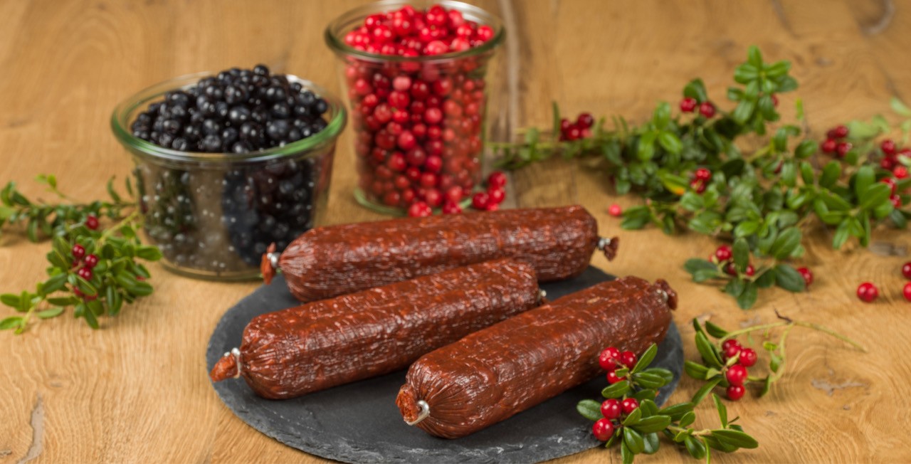 Zutaten: Hirschfleisch CH (50%), Schweinefleisch, Speck, Nitritpökelsalz (Kochsalz, Konservierungsmittel E250), Gewürze, Blaubeeren 1.5%, Preiselbeeren 1.5%, Maltodextrine, Dextrose, Antioxidationsmittel: E301, Würze